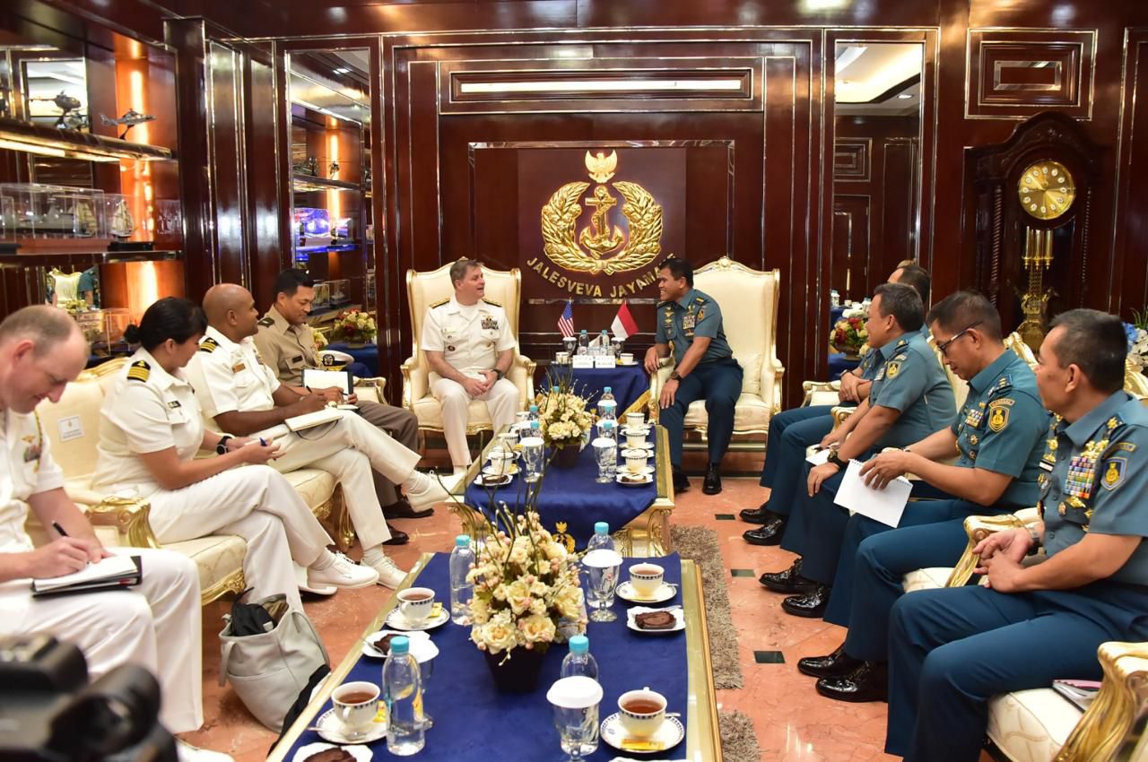 Jakarta, Dialoguejakarta.com – Kepala Staf Angkatan Laut (Kasal) Laksamana TNI Dr. Muhammad Ali didampingi Wakasal Laksamana Madya TNI Erwin S. Aldedharma menerima courtesy call Panglima Armada Ketujuh, Angkatan Laut Amerika Serikat, Vice Admiral Fred Kacher bertempat di Admiral Room, Gedung Utama Mabesal, Cilangkap, Jakarta Timur. Rabu (31/07).
