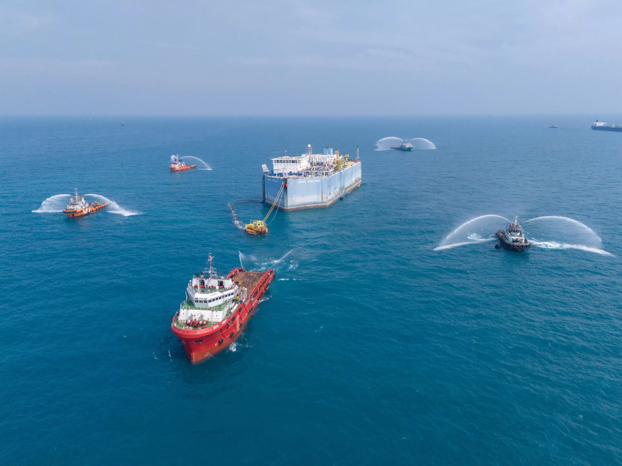 Lima kapal yang mengelilingi Arco Ardjuna merespons lengkingan itu dengan mengaktifkan sistem “Fifi”, atau firefighting. Semprotan air dari kapal-kapal ini dan lambaian tangan para kru pekerja mengiringi prosesi pelepasan FSO Arco Ardjuna