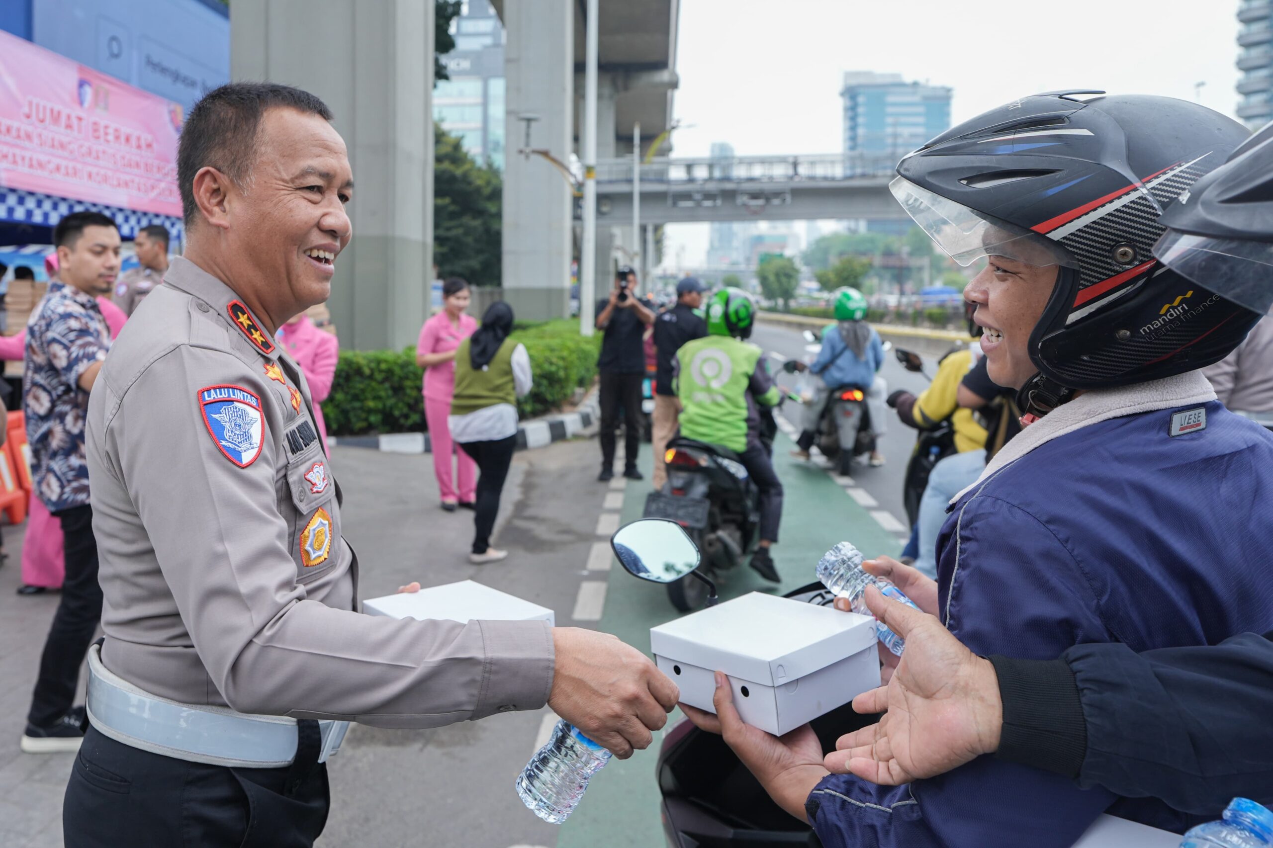 Jakarta,Dialogjakarta.com -Korlantas Polri kembali mengadakan program “Jumat Berkah,” dengan menyediakan makan siang gratis sebanyak 400 paket makanan bagi warga yang melintasi di sekitar Gedung Korlantas Polri, Jumat (1/11/2024).