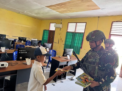 Para siswa tampak antusias menerima buku tulis yang dibagikan. Mereka juga berterima kasih kepada prajurit yang telah memberikan perhatian terhadap kebutuhan belajar mereka, dimana kegiatan ini menjadi salah satu bentuk kepedulian Satgas Kewilayahan Yonif 141/AYJP Pos Kimaam dalam membangun hubungan baik dengan masyarakat, sekaligus mempererat sinergi antara TNI dan dunia pendidikan di Papua Selatan. (Ajay)