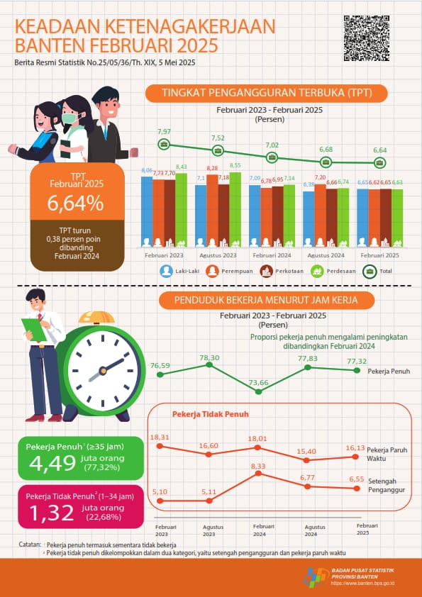Terkait dengan persentase setengah pengangguran dan pekerja paruh waktu pada Februari 2025 turun masing-masing sebesar 1,77 persen poin dan 1,88 persen poin dibanding Februari 2024. (BiroAdpim Banten/Yudhi)
