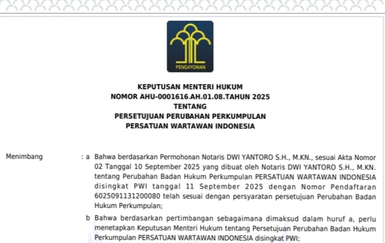 Penerbitan AHU PWI itu berdasarkan permohonan PWI Pusat hasil Kongres Persatuan PWI yang disampaikan kepada Kemenkum melalui permohonan Notaris Dwi Yantoro SH MKn, sesuai Akta Nomor: 02 Tanggal 10 September 2025 yang dibuat oleh notaris tentang Perubahan Badan Hukum Perkumpulan PWI tanggal 11 September 2025 dengan Nomor Pendaftaran: 6025091131200080 telah sesuai dengan persyaratan persetujuan perubahan badan hukum perkumpulan.