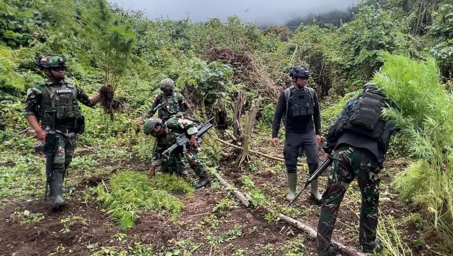 PAPUA, dialoguejakarta.com – (Puspen TNI). Operasi pengamanan wilayah perbatasan kembali mencatat keberhasilan penting. Satgas Pamtas RI–PNG Yonif 751/Vira Jaya Sakti (VJS) bersama Satgas Prayudha dan Satgas Ketapang berhasil menemukan empat kebun ganja tersembunyi di Kampung Aldom, Distrik Oksibil, Kabupaten Pegunungan Bintang, Papua, Selasa (23/9/2025).
