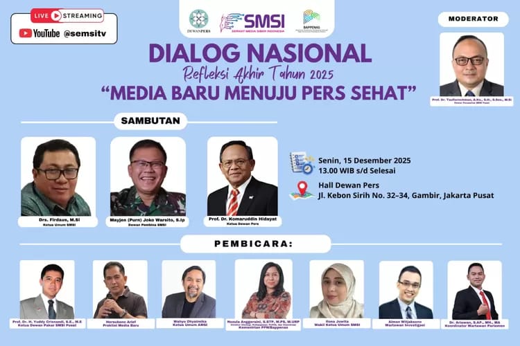 JAKARTA, dialoguejakarta.com – Dialog Nasional Refleksi Akhir Tahun 2025 dengan tema “Media Baru Menuju Pers Sehat” sukses diselenggarakan oleh Serikat Media Siber Indonesia (SMSI). Acara strategis yang bertujuan membahas masa depan pers digital ini dilaksanakan di Hall Dewan Pers, Jalan Kebon Sirih, Gambir, Jakarta Pusat pada Senin (15/12/25).