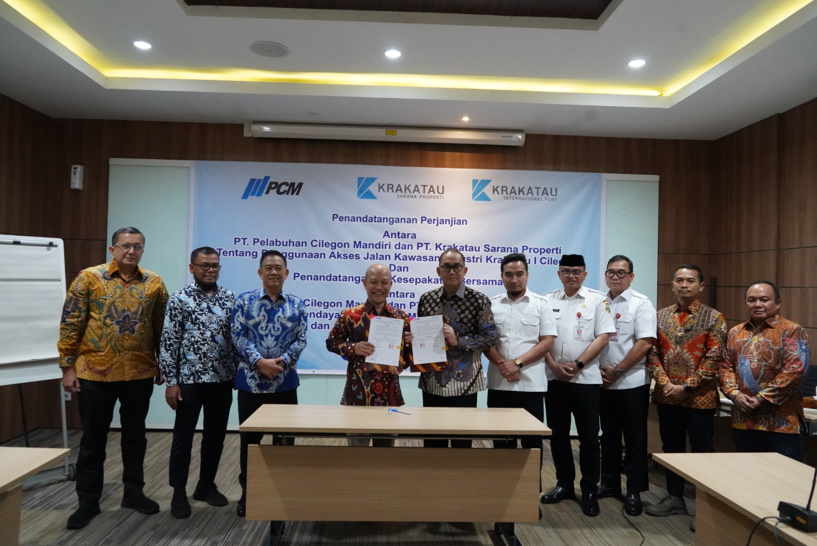 CILEGON, dialoguejakarta.com — Pemerintah Kota Cilegon mendukung langkah strategis penguatan sinergi antar badan usaha melalui Penandatanganan Kesepakatan Bersama antara PT Pelabuhan Cilegon Mandiri dengan PT Krakatau Sarana Properti tentang Penggunaan Akses Jalan Kawasan Industri Krakatau I Cilegon, serta Penandatanganan Kesepakatan Bersama antara PT Pelabuhan Cilegon Mandiri dengan PT Krakatau Bandar Samudera tentang Rencana Pendayagunaan Aset Milik PT Pelabuhan Cilegon Mandiri dan Jasa Kepelabuhanan Lainnya.