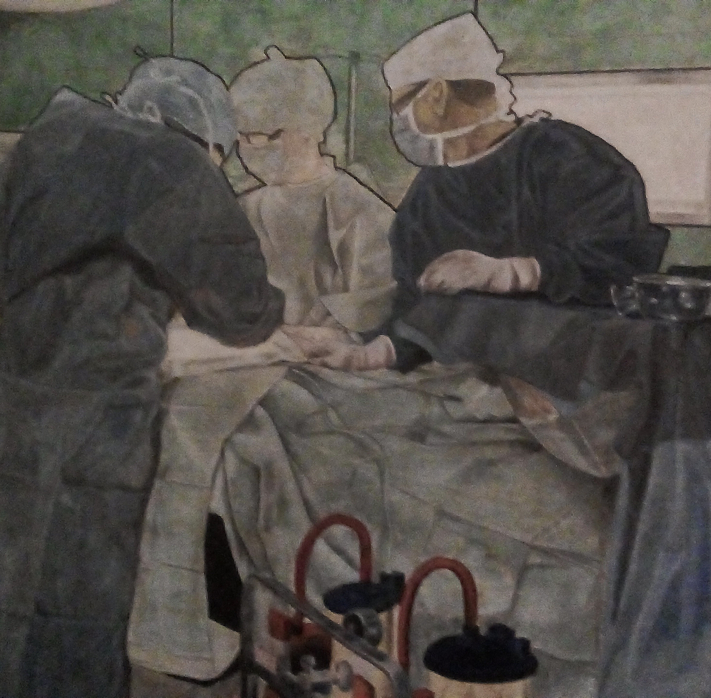 Sudjud menjelaskan, pada karya lukis pertama ada sekelompok tenaga medis yang digambarkan dalam balutan seragam biru-hijau steril. Mereka berkerumun, menciptakan sebuah massa figuratif yang tegang. Fokusnya bukan pada wajah—yang tertutup masker—melainkan pada gestur tangan yang sedang melakukan tindakan bedah. Cahaya jatuh secara tajam pada bagian masker dan bahu, menciptakan efek dramatis yang mencekam. Latar belakang lukisan ini adalah sebuah kejutan tekstual. Alih-alih ruang kosong, Wisnu mengisinya dengan guratan teks, skrip, dan catatan medis yang tumpang tindih (Undo, 2026). “Ini menciptakan kesan ‘kebisingan visual’ di balik kesunyian prosedur medis yang dingin,” ujar Sudjud.