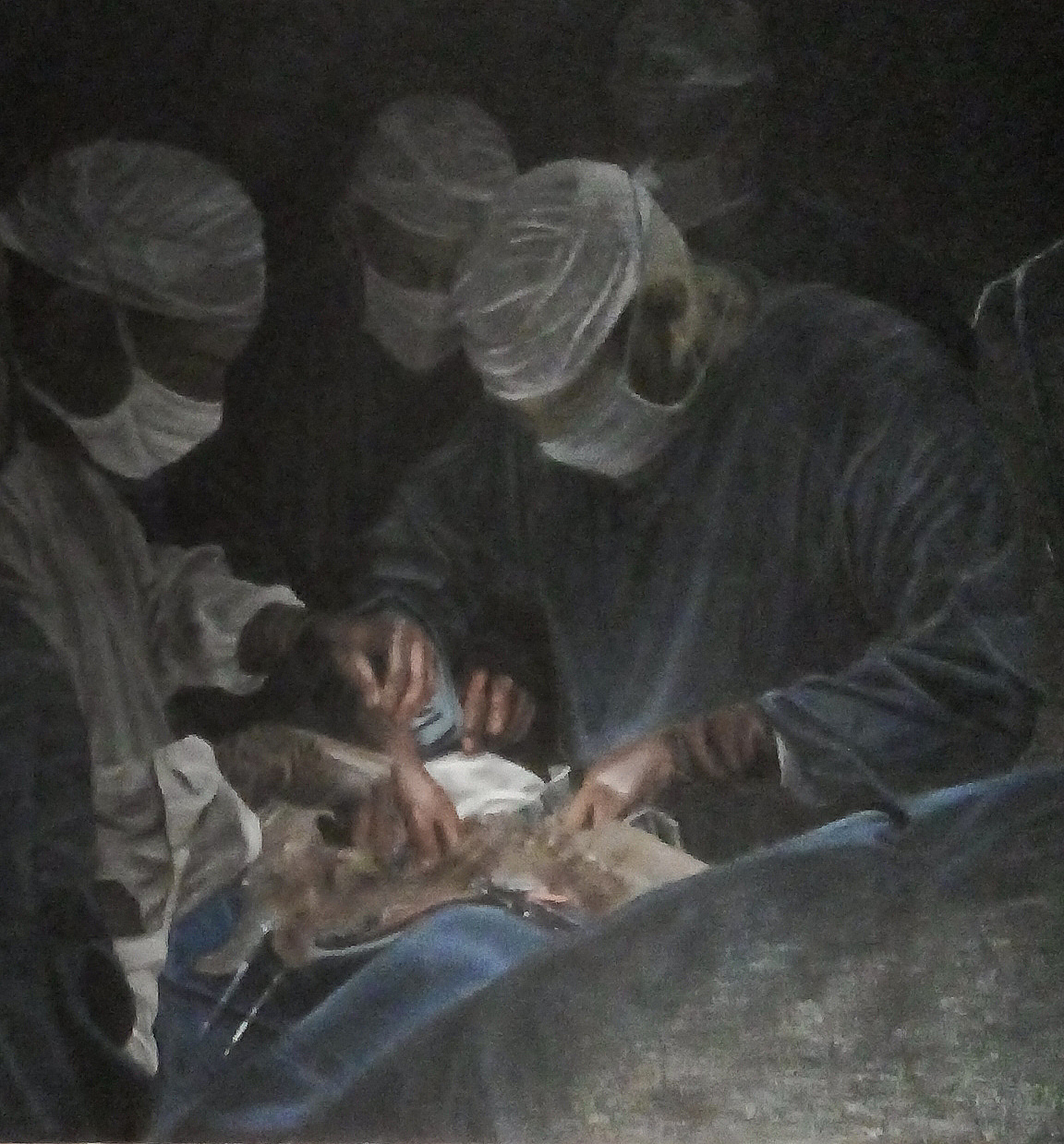 Yogyakarta, dialoguejakarta.com – Pengunjung disambut suasana temaram saat memasuki ruang pamer Jogja Gallery, Yogyakarta. Setelah berjalan beberapa langkah, pengunjung dihadapkan dengan dua struktur tembok dalam posisi menyiku. Tembok yang mencitrakan susunan batu bata itu berisi dua lukisan yang menggambarkan suasana ruang operasi medis di rumah sakit. Tembok sebelah kanan menampilkan empat tenaga medis dengan kepala berbalut topi dan masker menutup mulut, kelihatan seperti sedang menangani proses operasi terhadap pasien di atas tempat tidur dalam suasana temaram. Tidak nampak visualisasi operasi medis yang dilakukan secara spesifik. Sementara tembok sebelah kiri juga menampilkan citraan suasana di ruang operasi yang lebih tetang, tapi juga tidak menunjukkan secara spesifik tindakan medis yang sedang dilakukan. Secara visual perbedaan yang menonjol pada dua lukisan ini hanyalah terpaan cahaya di dalam ruang operasi. Hal yang menyatukan keduanya adalah adegan yang mengesankan situasi darurat meski tidak menunjukkan gestur yang spesifik namun seperti mendorong harapan akan terjadi keadaan yang lebih baik.