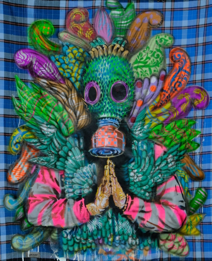 Anagard menghadirkan karya lukis dengan media yang tak biasa berupa kain sarung bercorak kotak-kotak dalam warna biru yang di atasnya lukisan figur setengah badan dengan kepala dan wajah tertutup masker anti polusi (respirator), sementara posisi kedua telapak tangan menempel di depan dada sebagai tanda hormat seolah memohon agar penguasa menjaga lingkungan seperti yang dia ungkap lewat ornamen beragam tumbuhan yang memenuhi tubuh bagian atas figur ini (Welcome Pollution, 2026).