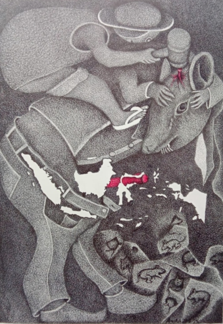 Ketajaman pandangan Ames Abadi terhadap isu sosial, politik, dan hukum lewat karya drawing bak ujung balpoin yang runcing menekan permukaan kertas dengan menebar ribuan titik di atasnya di tengah kesendiriannya.■ Raihul Fadjri