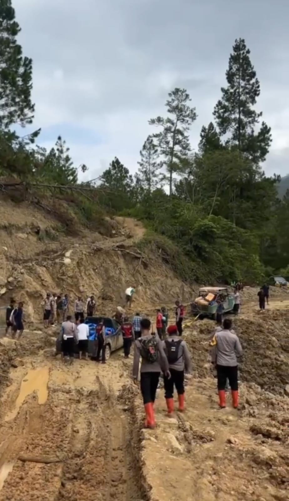 Perjalanan menuju Kecamatan Pining dihadapkan pada berbagai kendala, mulai dari jalan licin, lumpur tebal, hingga material banjir yang menutup hampir seluruh jalur. Di sejumlah titik, rombongan harus berhenti dan menunggu alat berat membuka jalan. Kapolres bersama unsur pemerintah daerah secara langsung mengawal proses pembukaan akses agar jalur dapat segera dilalui.
