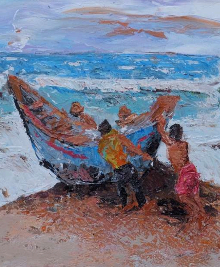 Sebagian karya lukis lainnya berupa lanskap di tempat di wilayah pesisir Kabupaten Bantul. Ada keramaian di tepi pantai dengan perahu yang tertambat dan sejumlah figur yang membawa ikan hasil tangkapan (Pasar Ikan, 2025). Ada juga empat figur di tepi pantai sedang mendorong perahu dengan sekuat tenaga di tengah gejolak ombak laut (Holobis Kontul Baris, 2025).