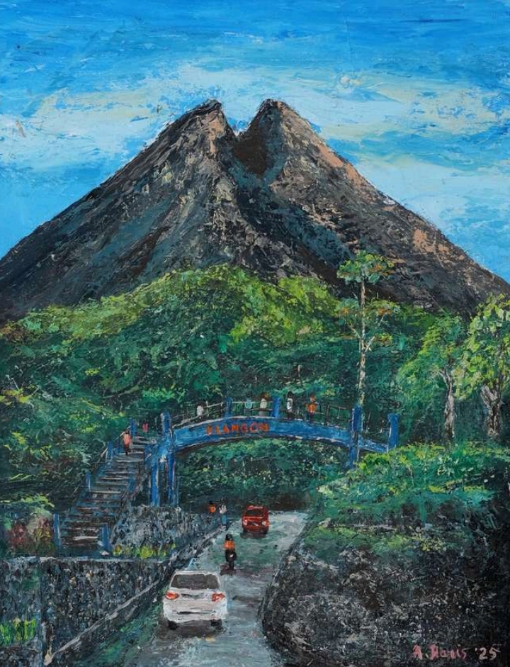 Abdul Haris juga ‘merekam’ suasana hening di salah satu tempat wisata alam berupa citraan bentuk rumah dengan jejeran pohon rindang di sekitarnya (Lintang Sewu, 2025). Ada juga hamparan kehijauan pepohonan dan gunung menjulang di belakangnya dengan keindahan latar kebiruan langit (Merapi, 2025).