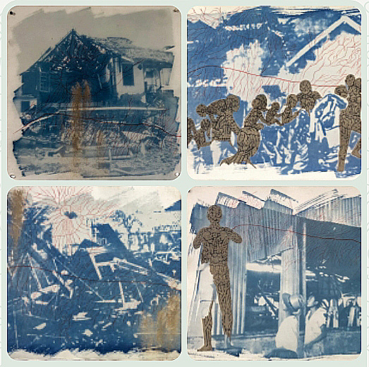 Ada kerumunan warga dalam situasi panik sedang berlari menyelamatkan diri saat erupsi sedang berlangsung (The Ground of Fire #13, 2026). Ada juga potret bagunan rumah yang rubuh (The Ground of Fire #5, 2026). Atau potret permukiman dengan kondisi bangunan rusak dan kosong karena sudah ditinggalkan warganya yang mengungsi (The Ground of Fire #21, 2026).